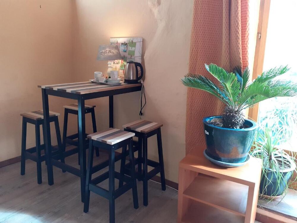 Aan de grote eettafel in de eetkamer ontbijten we ’s morgens samen en ’s avonds kan er aangeschoven worden bij de maaltijd.